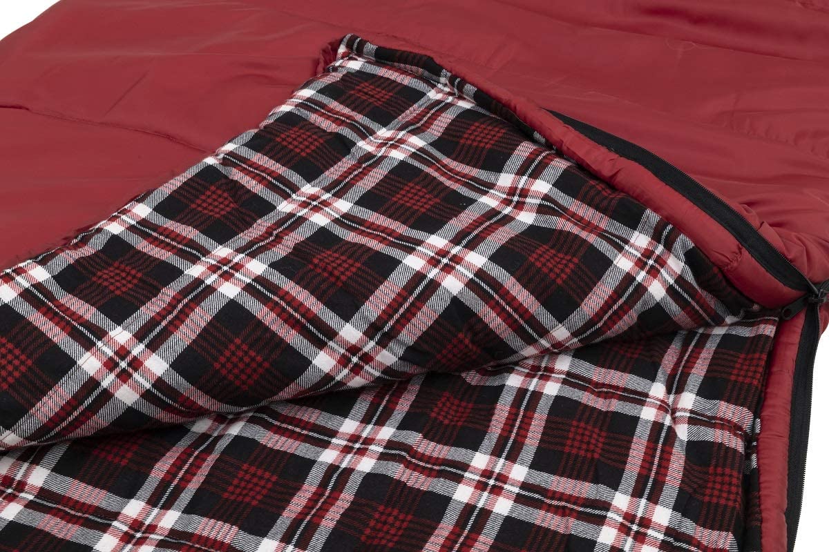 The French River Trail is a roomy rectangle bag with an oversized hood. It uses a 2-layer construction to help eliminate cold spots and keep you warm. There is also a zipper baffle to help seal in your body heat. It is composed of a 100% cotton flannel liner and rugged cotton canvas outer. When it's time to store or transport the bag, it conveniently rolls up with the roll-up straps so it's easy to carry and doesn't take up too much room. Two-layer construction, 100% Cotton Flannel liner, 190T Polyester Outer, Roll-up straps and standard stuff sack. Temperature Rating: +25°, Length: Long, Size 33" x 78", Total Weight: 5 lbs, PolyLoft Insulation, 48 oz. Fill Weight, #5 Separating Zippers, Packaging is Bilingual.