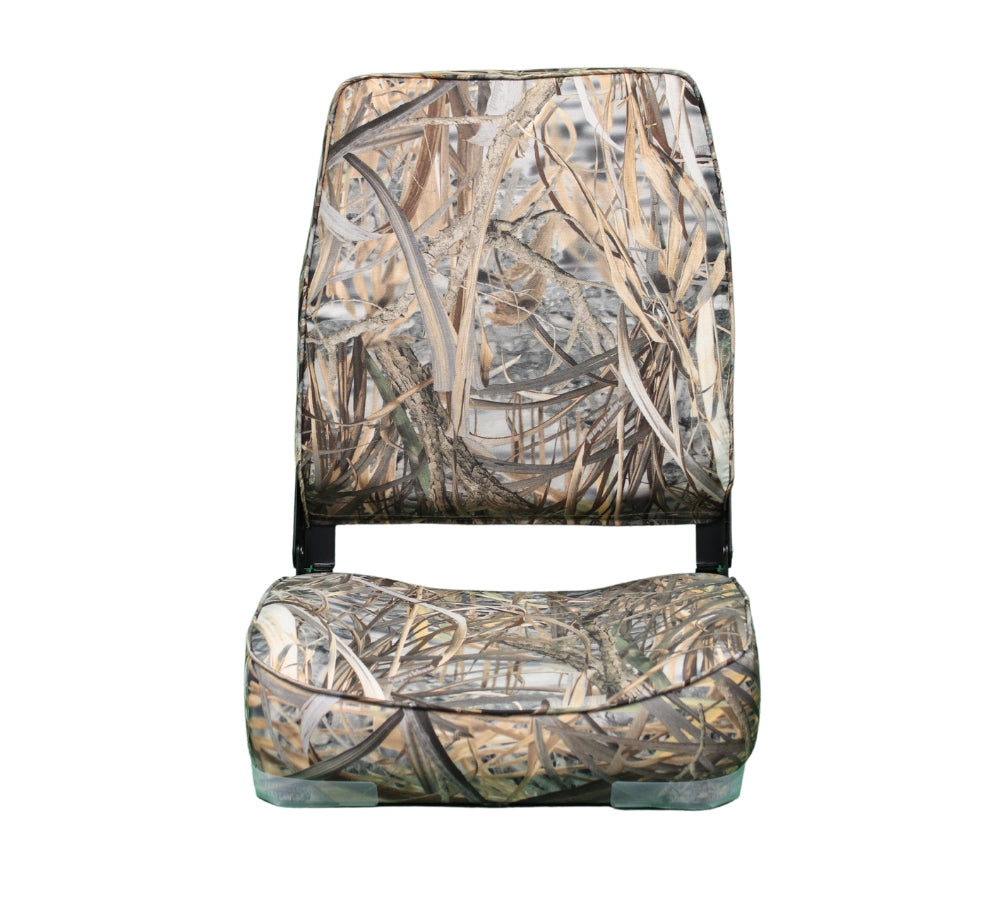 Introducing the Blue Dog Marine High Back Classic Fold Down Seat in Camo color, the perfect addition to any boat for ultimate comfort and durability. Constructed with mildew-resistant and UV-treated marine-grade vinyl, this seat is built to last in harsh marine environments. The high-impact marine-grade frame with pinchless aluminum hinges ensures durability and sturdiness, while the compression foam padding provides ultimate comfort during long boat rides. The seat is easy to install on any standard pedestal or mounting surface. Don't compromise on comfort and quality, upgrade your boat with the Blue Dog Marine High Back Classic Fold Down Seat today.