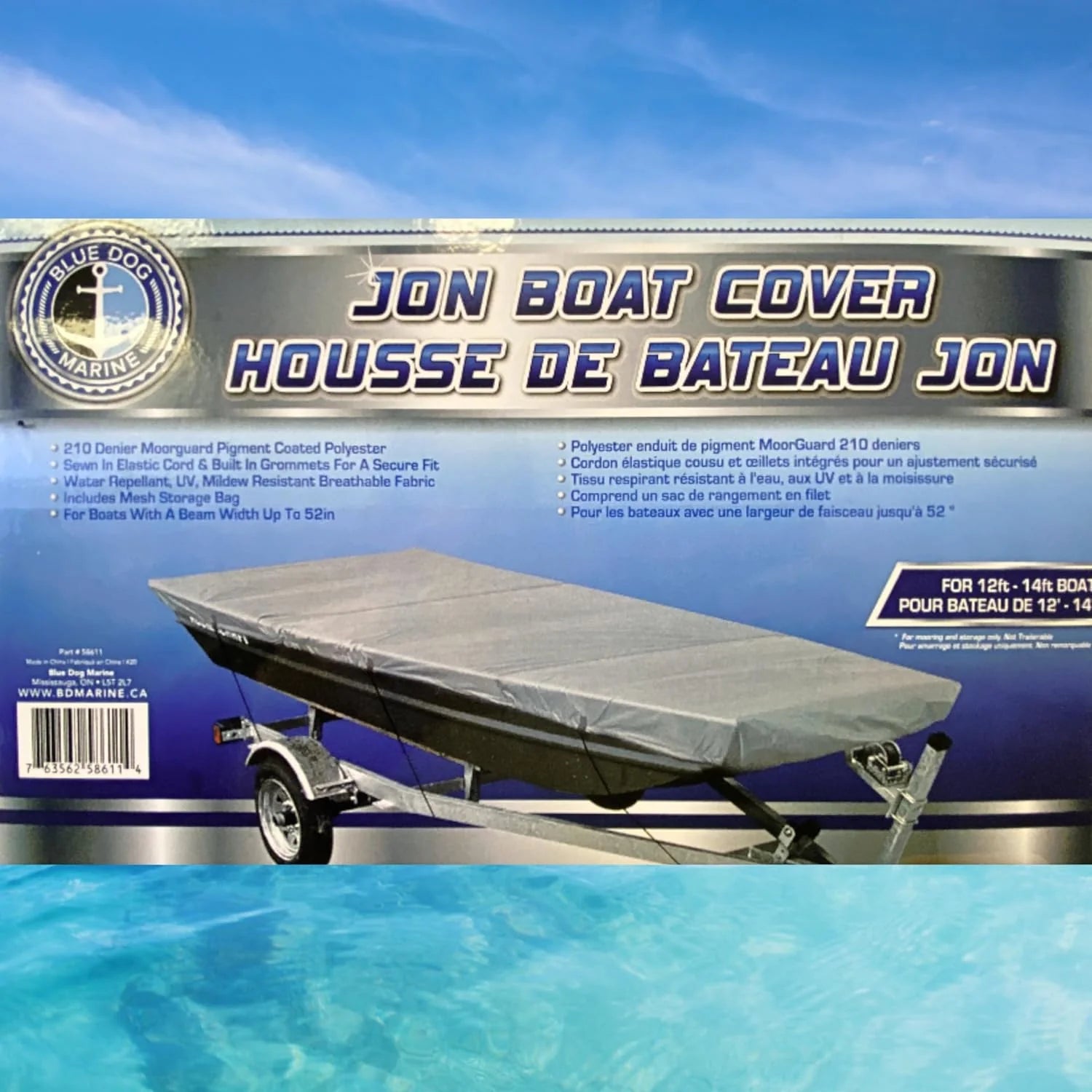 The Blue Dog Marine Jon Boat Cover is a specially designed, durable cover for Jon Boats with a beam width up to 52" and a length of 12' to 14'. Constructed from 210 Denier Moor Guard Pigment Coated Polyester, it offers reliable protection against environmental factors including water, UV rays, and mildew. It features a sewn-in elastic cord and built-in grommets for a secure fit, air vents to prevent mold and mildew, and comes with a mesh storage bag for convenience. This high-quality boat cover provides comprehensive protection, ensuring your boat remains in excellent condition.