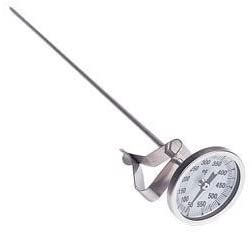 Take the guesswork out of your cooking and accurately measure temperatures with this heavy duty 12 inch thermometer. Measure temperatures up to 550° F on the analog readout dial. A convenient clip is included for easy pot attachment.
