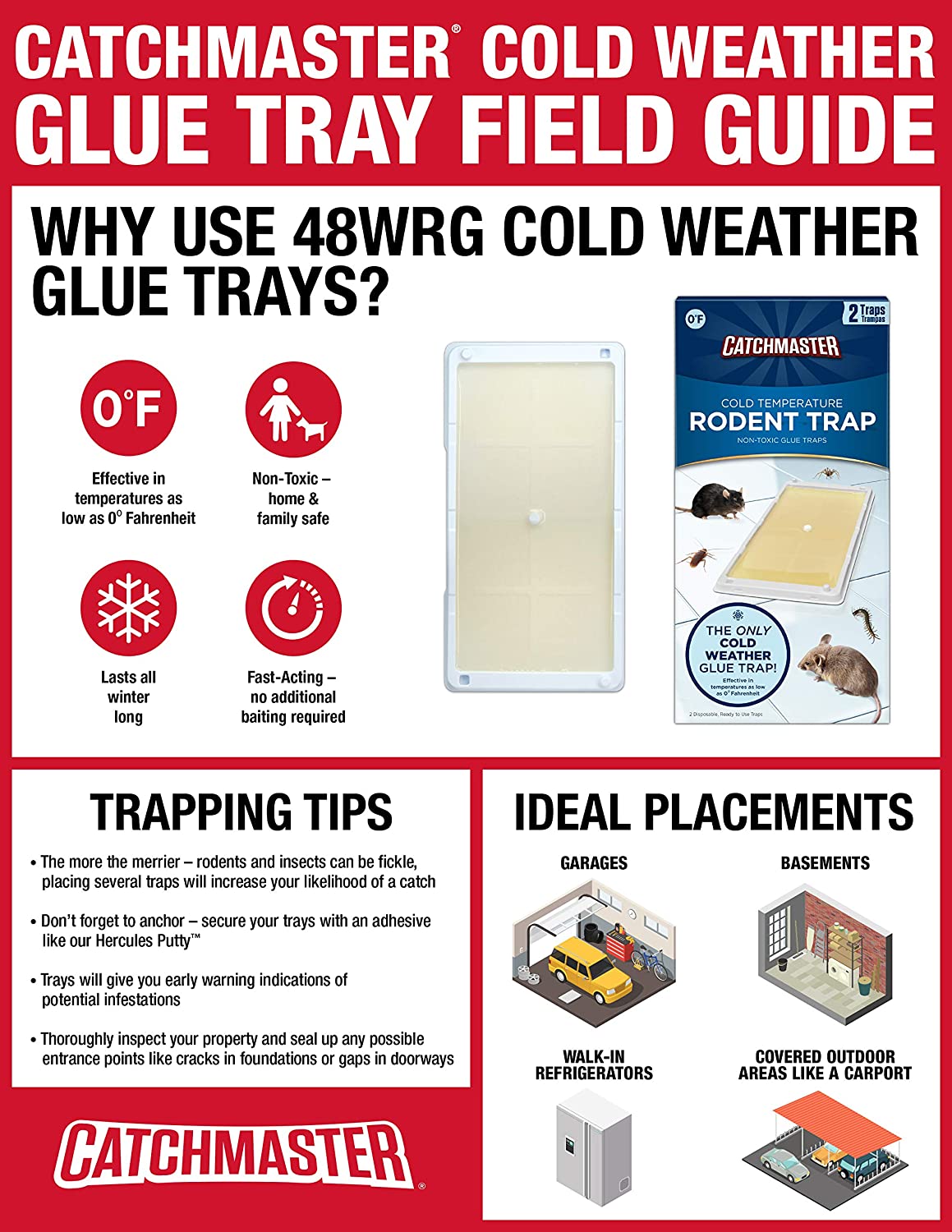 Eliminate rats with ease using Catchmaster's Cold Temperature Rat Size Glue Traps - 2 Pack. These heavy-duty traps are professional strength and require no additional baits, making them convenient for your pest control needs. Designed to work in temperatures as low as 0 degrees Fahrenheit, these traps are perfect for unheated areas like basements, sheds, or garages. With a specially designed adhesive formula, these traps are effective in trapping rats and are non-toxic and disposable. Keep your space rodent-free with Catchmaster.