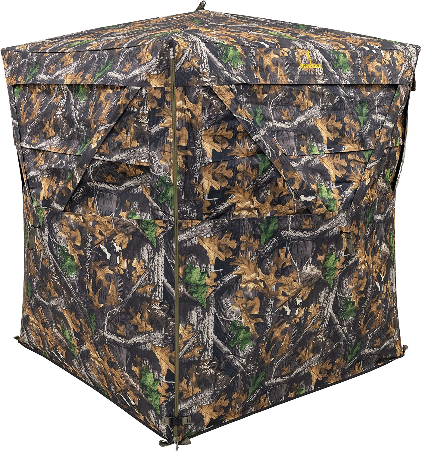 The Elude provides maximum concealment in a conventional ground blind platform but with innovative features to enhance stealth and in-the-field functionality. Built from durable 600D polyester, the Elude walls are dressed in Shadow-Flauge 2.0 camo to provide optimal blending into any environment, in any season. A blacked-out interior works with mesh windows to ensure deep concealment. The Elude presents hunters with window options to best suit the hunting situation. Windows placed 360-degrees around the blind open and close effortlessly and quietly on the Silent-Trac window system. No more noisy buckles or fumbling with elastic straps and hooks. This system also allows for unlimited window positioning, providing as much or as little opening as needed for the situation. Two sides of the blind feature screen mesh and two without. Additional features of the Elude blind include oversized #10 zippers for solid door closure, a separating door bottom for easy take-down, strong fiberglass pole support, aluminum hubs with engineered tips and pins, and stakes with four tie-downs. The Elude transports in a rugged shoulder carry bag.