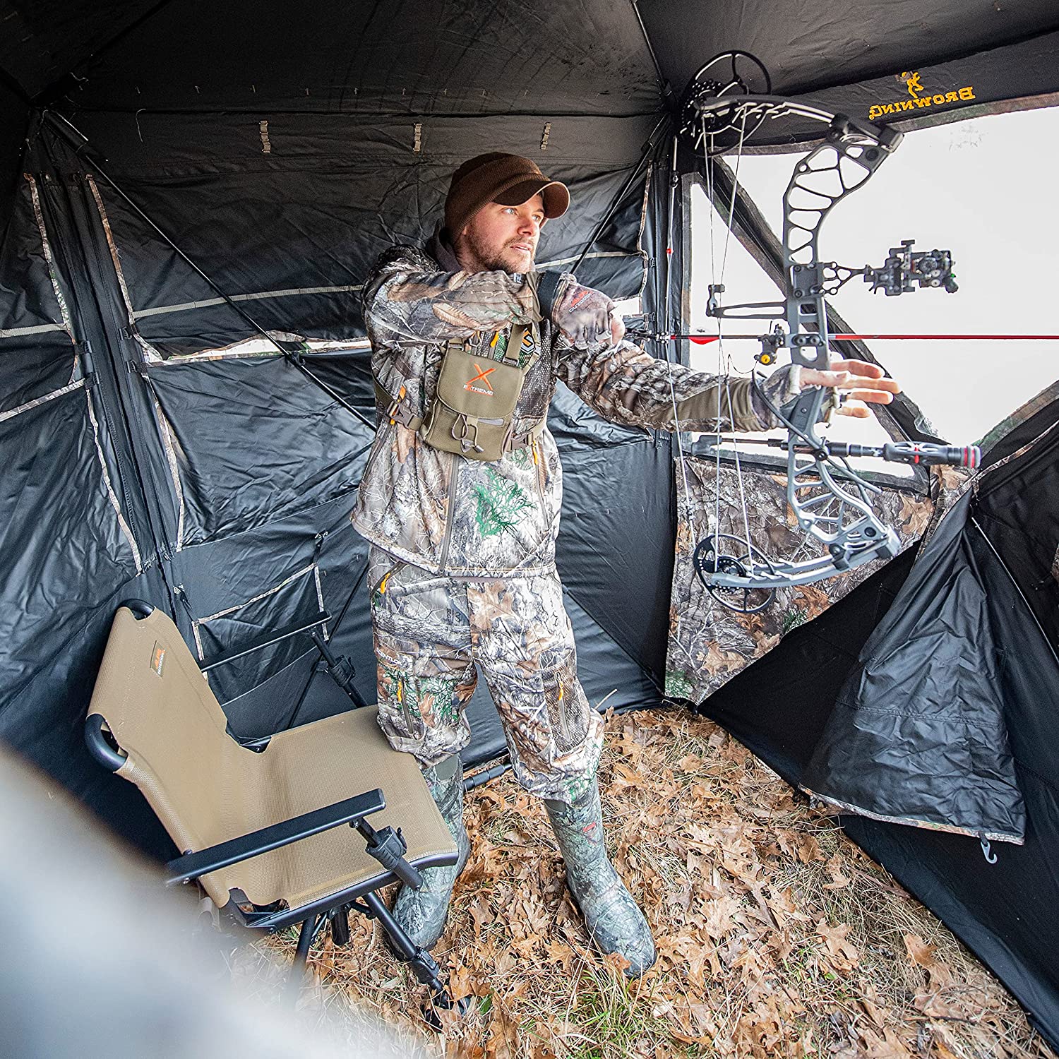 The Envy blind was developed to address the needs of ground-based bowhunters or any hunter who counts maneuverability, silence, and maximum concealment as high priorities. Featuring an 82-inch (6’ 10”) center height and 74-inch shooting width, the Envy allows compound shooters to stand when taking the shot and the tall center height means traditional bowhunters can shoot from a seated position without limb impact. Incorporated into the Browning Envy blind are silent-operation features such as a Silent-Trac window system that not only permits the windows to be raised or lowered quietly but also provides near infinite adjustability to meet changing concealment and shooting position needs. Another addition to stealth comes via the QuickConnect silent-entry door system. This system utilizes magnets along the door seam for silent entry and exit, and no-fumble hooks to ensure the door remains closed even in high-wind conditions. A durable 600D polyester fabric comprises the Envy’s wall and window curtain construction while the shoot-through mesh is used across the 180-degree window openings. Support comes from strong and flexible fiberglass poles connected to aluminum hubs featuring engineered tips and pins. In addition to the 180-degree window placement, the Envy incorporates two camera window ports for still photography or video applications and a 360-degree ground skirt to deliver maximum concealment, minimize light intrusion, and help keep the scent in. Available in Realtree EXCAPE™ and Mossy Oak® Country DNA®, the Browning Envy blind also includes a bow hanger, deluxe stakes with tie-downs, brush loops, and four gear pockets. Overall weight is 23 lbs.