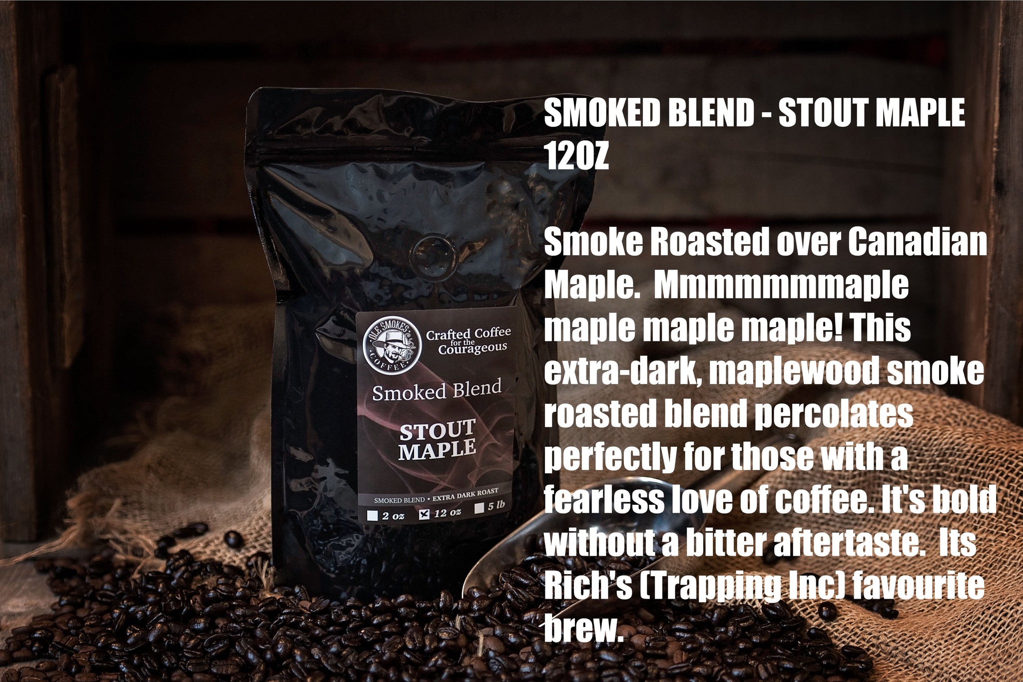 Embrace the robust flavors of our Stout Maple - Smoked Blend - Extra-Dark Roast, delicately smoke-roasted over Canadian Maple. This extraordinary blend, free from any bitter aftertaste, is perfect for brave coffee enthusiasts and a personal favorite of Rich from Trapping Inc. At Ole Smokes Coffee, it is crafted from traditional way, instilling love and time into each batch, resulting in a daringly well-crafted brew.