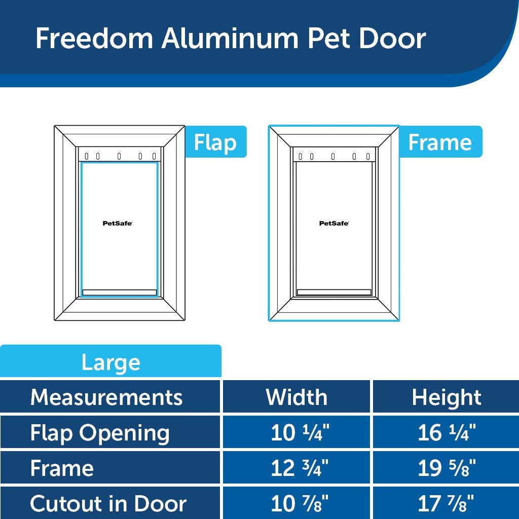 The PetSafe Freedom Aluminum pet door gives your pet all the freedom it needs. Easy to install, the solid aluminum frame has reinforced corners for heavy use or for multiple pet homes. The flexible, soft flap is tinted and adjustable and has a magnetic closure and pile weather-stripping along the sides to form a weather-resistant seal. A closing panel is included for improved weather-resistance and to control your pet's access to the pet door.