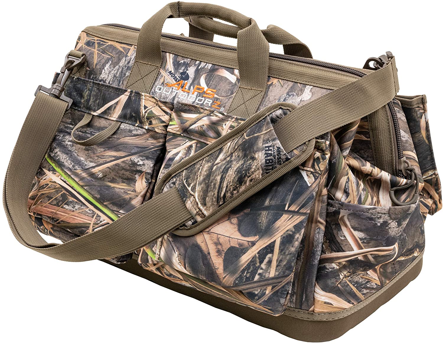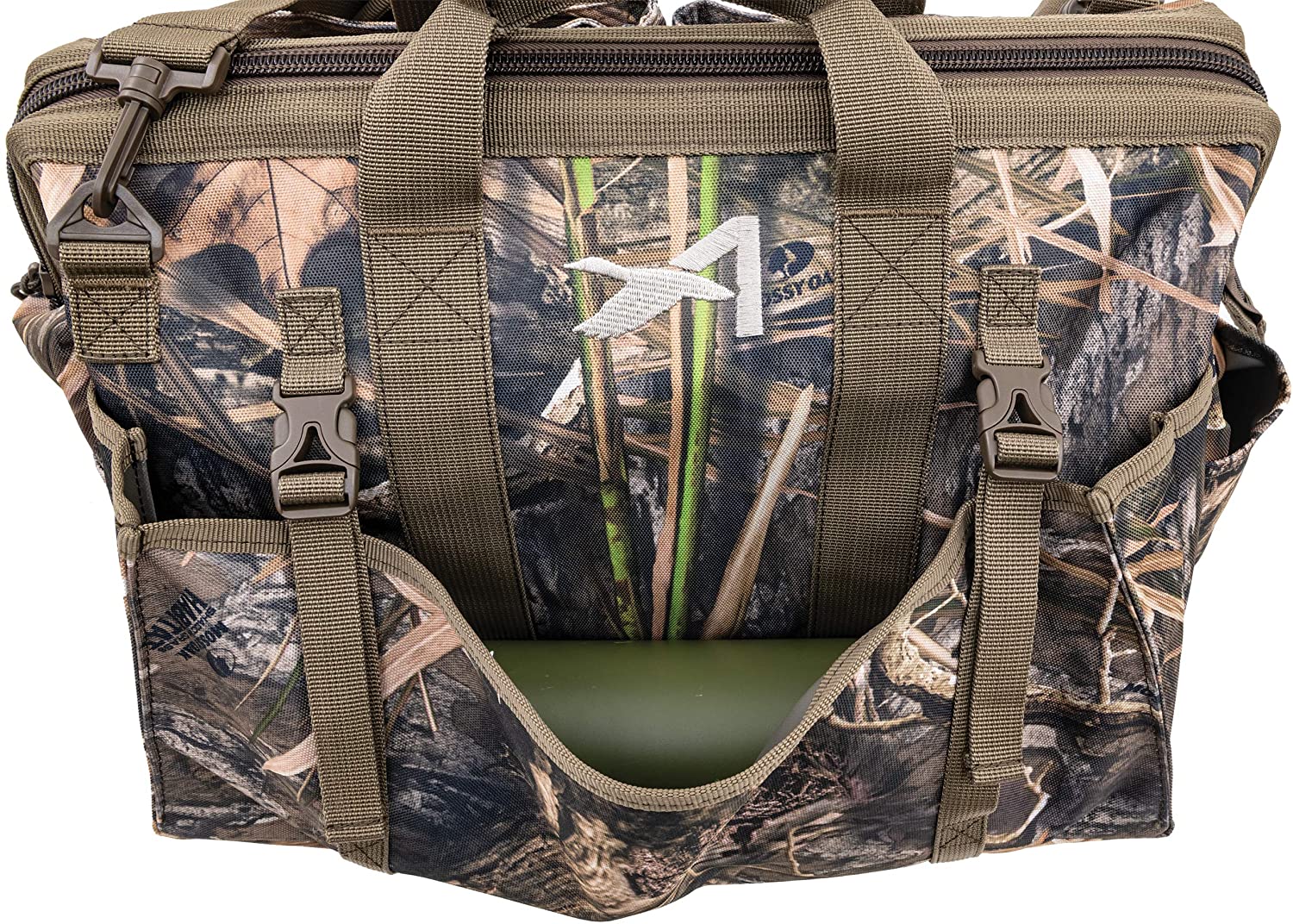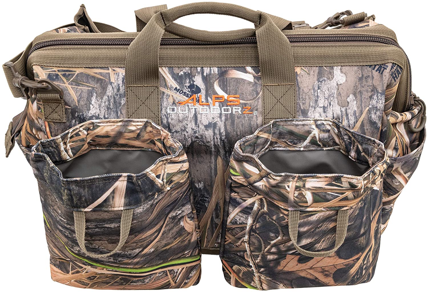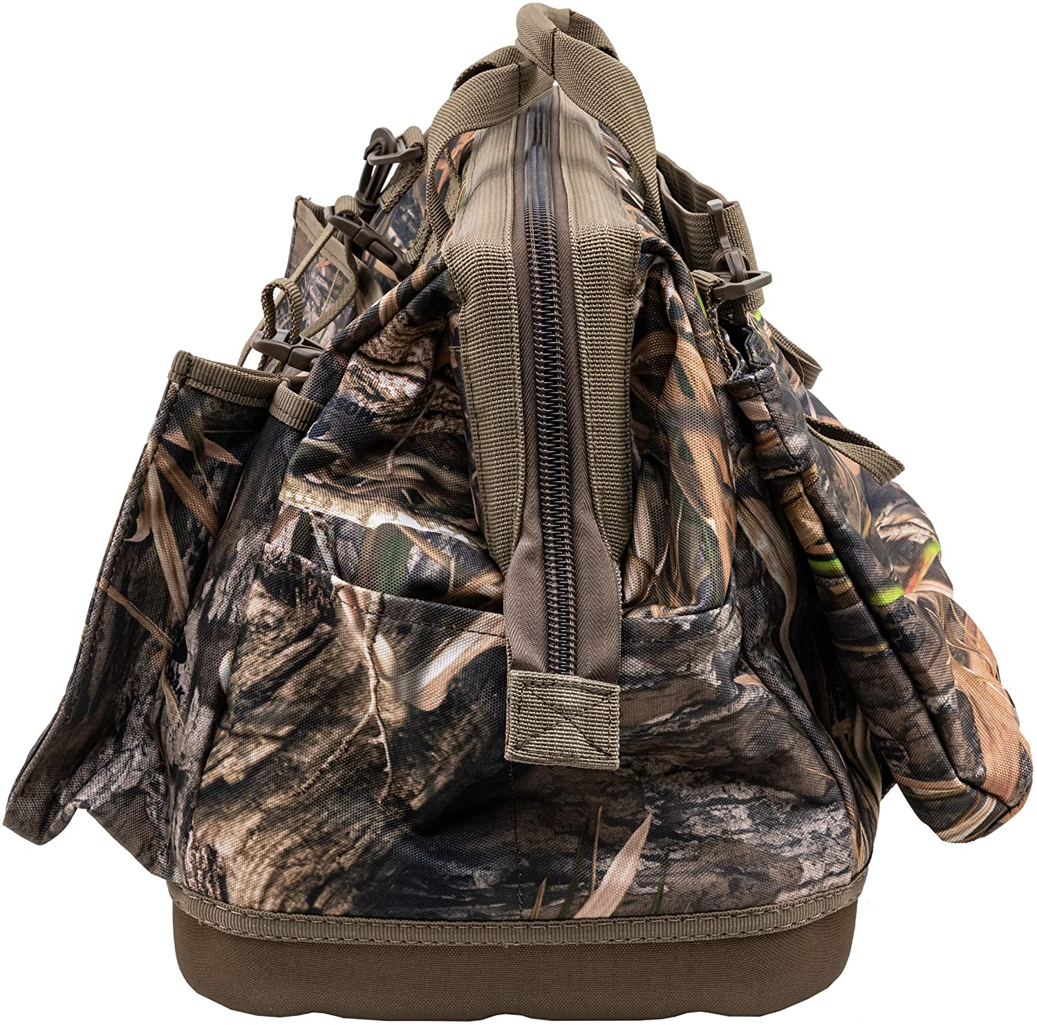 The Pit Blind Bag features a large pop-open main compartment with a removable divider to customize the content load. Additional interior pockets keep smaller items separated and within easy reach. Outside, the Pit Blind Bag boasts two hold-open pockets. These are designed to hold different shells organized and quickly accessible when switching between shot loads. An extra-large exterior pocket is also included to provide storage for a thermal beverage container or for use as an additional gear storage option. Two sewn-in carry handles flank the rugged zippered top, while a removable, adjustable and padded shoulder strap offers hands-free carry. Rounding out the key features is a waterproof, molded bottom panel to provide added support and content protection when the bag is sitting on wet ground.