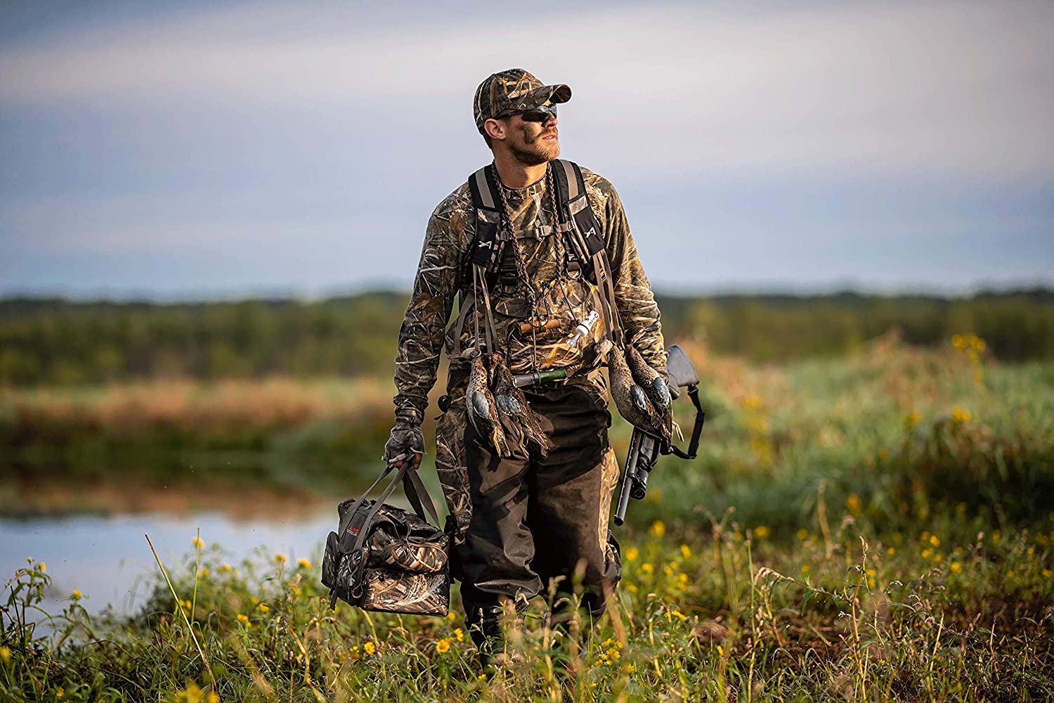 This slip ring game tote is perfect for easily hauling your birds home from the field. The slip ring game tote has multiple features built in, including steel slip rings, a swivel clip to hang from your waders or other gear, and an "under-arm" adjustable webbing strap to keep your hands free. The slip ring game tote also features webbing reinforcement for added strength, and a slip resistant backing to ensure it will stay on your shoulder during travel.